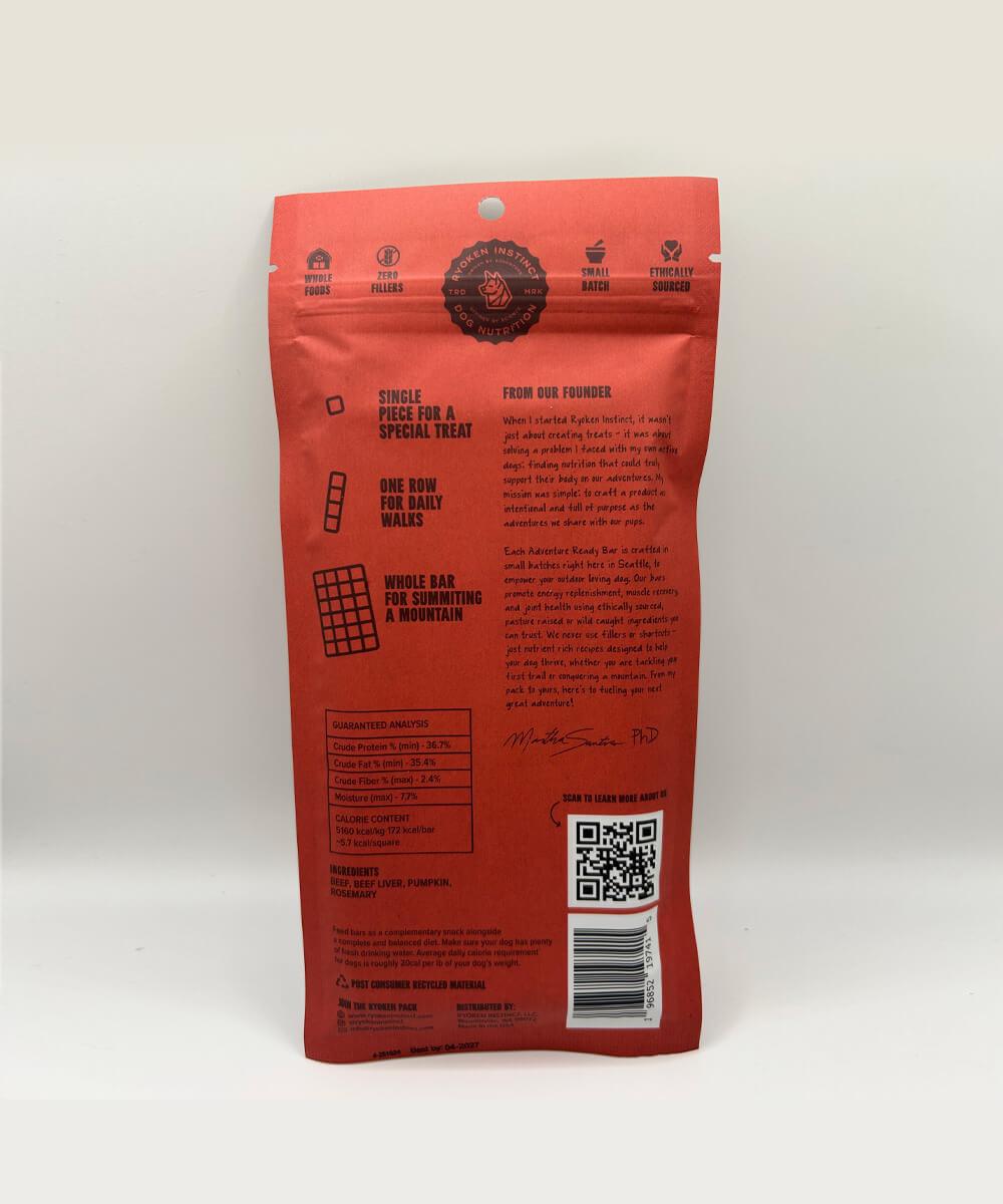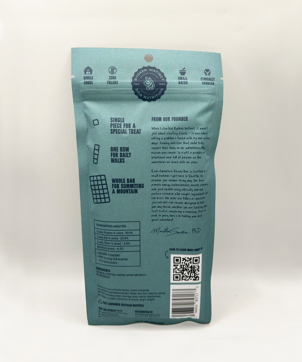 Created on the trail by Martha, a Stanford PhD and lifelong adventurer, this bar was born when she couldn’t find treats that met the metabolic needs of her dogs, Miru & Miji—so she made one. Handmade in Seattle using clean, science-backed ingredients for pet parents who live life on the move.